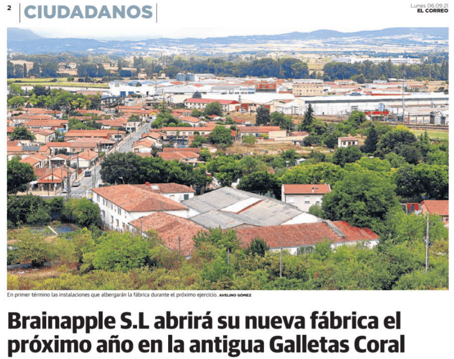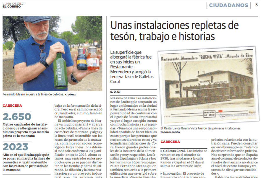 Compartimos con vosotros un reportaje que nos hicieron en El Correo sobre nuestro proyecto Brainapple y sobre la nueva fábrica que abriremos en las instalaciones legendarias de Galletas Coral, en Miranda de Ebro. Unas instalaciones repletas de tesón, trabajo e historias, el mejor lugar para desarrollar nuestro proyecto agroindustrial.