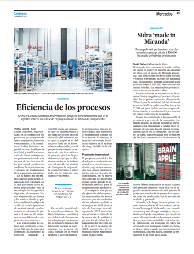 Empresa XXI, el periódico quincenal de referencia de la industra vasca, ha publicado este mes un artículo sobre Brainapple: Sidra “Made in Miranda”.
